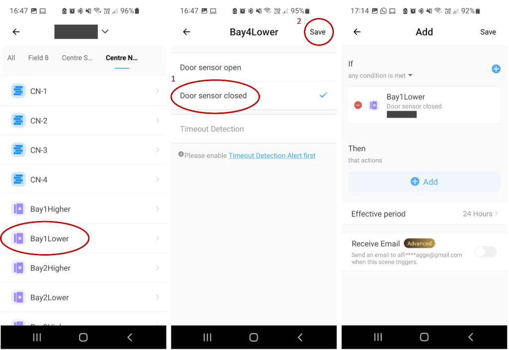 Select the field where the sensor is located and specify the sensor you want to be used as the trigger. Click on the sensor of interest. In this example, Bay1Lower will be used. Then click on the action of the sensor that triggers the scene, that is, ‘Door sensor closed’, and save the settings.