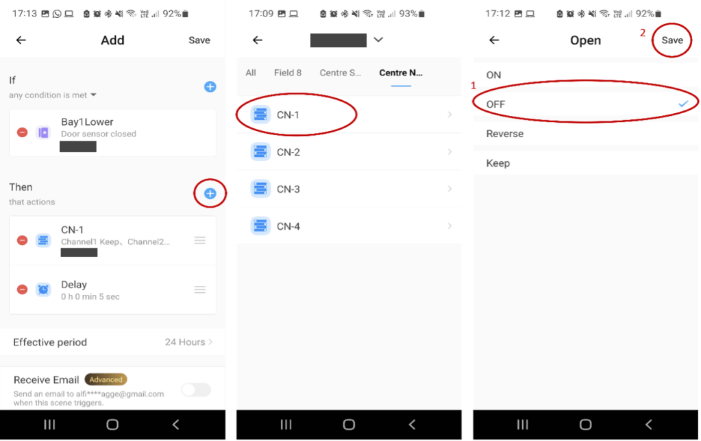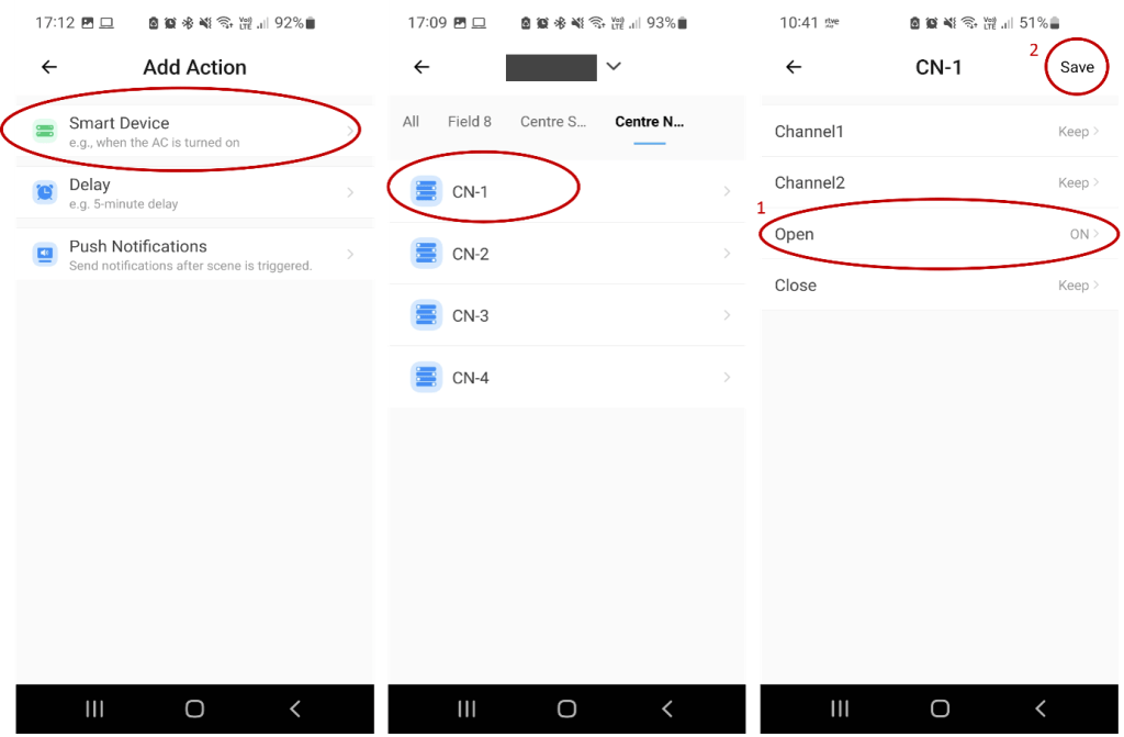 With these settings, the gate will open completely when the action is triggered. To partially open the gate, another action must be added for the gate to stop opening at a specified period of time using the ‘Delay’ option. Click on the ‘+’ symbol, then choose ‘Delay’ and specify the time you want the gate to remain in opening mode. In this example, this period will be 5 seconds. Then save the settings. Click the ‘Add’ button again to add the action to occur after the specified period. Select ‘Smart Device’ and choose the Wi-Fi switch of interest (CN1 in the example). Clock on ‘Open’ and select ‘OFF’. Then save the settings. When the scene is triggered, the gate will open and stop opening after 5 seconds.