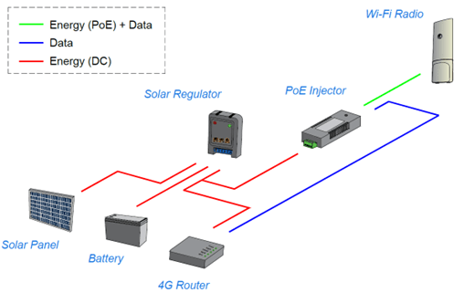 Step 2: Prepare a waterproof box to house the equipment. Create holes in the box to allow cables from the solar panel, battery, ethernet cable for the Wi-Fi radio, and cable for the 4G antenna to pass through. The 4G antenna will be connected to the 4G router. Dimensions of the box used in the field tests are: 330mm x 250mm x 160mm. Optionally there is also pods with waterproof boxes of 270mm x 220mm x 180mm.