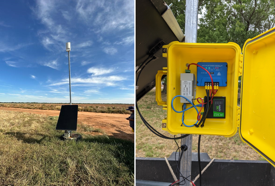 Step 11: Arrange the 4G router, solar regulator, PoE injector, and other equipment inside the waterproof box. Fix the box onto a metallic pole, ensuring it is at a height of minimum 1.0m from the top of the tire.