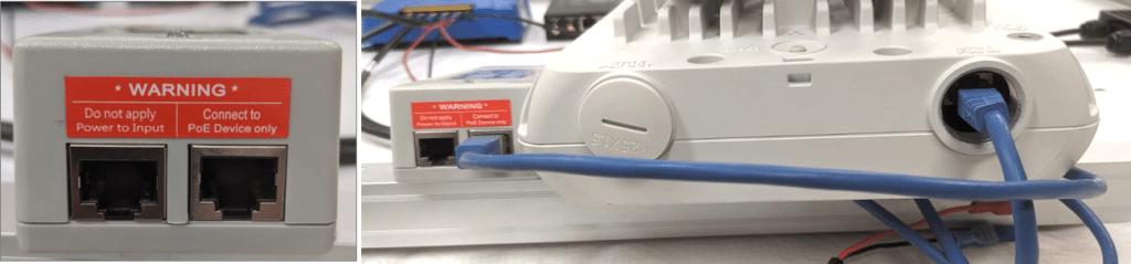 Step 9: Connect a long Ethernet cable to the ethernet 1 interface on the Wi-Fi radio. Connect the other end of the cable to the Ethernet interface of the PoE injector, which may be labelled as “PWR PoE,” “OUT,” or “Connect PoE device only.”